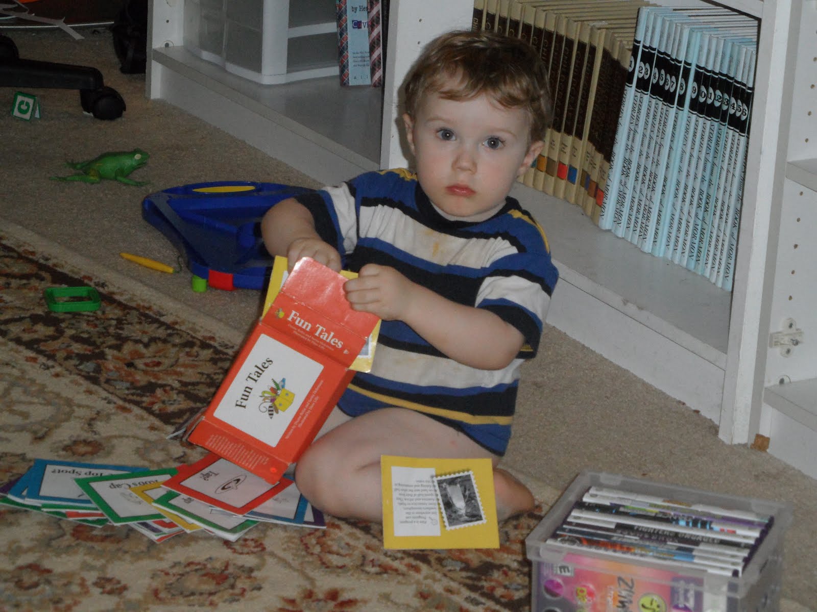 Alastor usually likes to color while we do worksheets (we just call them 'papers' since 'worksheets' sounds boring), but today he marched to the beat of his own drum. I found him playing with Gilgamesh's kindergarten readers and some alphabet block books. He wouldn't be enticed away except by homemade popsicles...